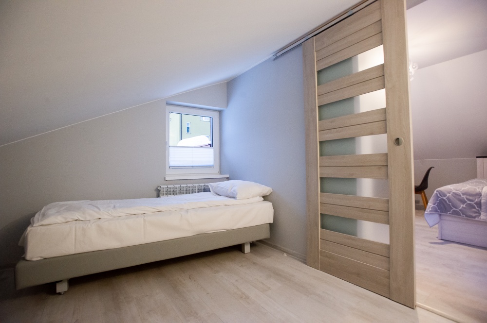 Apartament znajduje się w oddzielnym budynku, około 150m od głównego budynku, jest na pierwszym piętrze i posiada balkon. W środku są dwie oddzielne sypialnie, jedna mniejsza z dwoma pojedynczymi łóżkami (przeznaczone dla dzieci) i druga gdzie znajduje się jedno podwójne łóżko małżeńskie. Znajduje się też łazienka z dostępnymi ręcznikami dla gości i w wyposażeniu mamy także lodówkę, telewizor, czajnik elektryczny, a na parterze jest dostępny aneks kuchenny. Powierzchnia apartamentu to około 25m2.